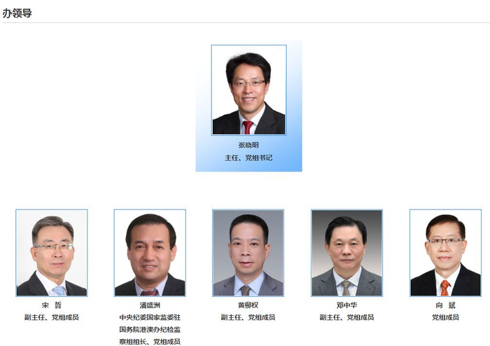 此次向斌履新后,国务院港澳办领导班子有6人,分别是:主任、党组书记张晓明,副主任、党组成员宋哲,中央纪委国家监委驻国务院港澳办纪检监察组组长、党组成员潘盛洲,副主任、党组成员黄柳权、邓中华,党组成员向斌。
