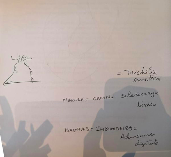 采访中科托提及有些树会用于埋葬尸体,在莫桑比克有三种,在不同的语言中有不同的叫法。分别是Marula(非洲漆树,又被称为Canhv),Baobab(猴面包树,也被叫做Imbondeiro,Digitata),以及Trichilia emetica(拉丁名,纳塔尔桃花心木)。米亚·科托还画了一张树的示意图。