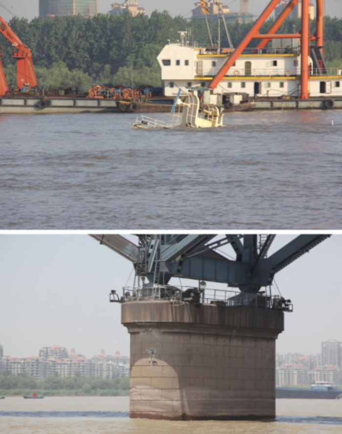 据不完全统计,南京长江大桥从通车至2013年,共发生35起桥体被撞事故,但这些撞击都没有产生实质性的伤害。最悬的一次,是2013年一艘万吨海轮碰擦大桥桥墩后沉没,船员全部获救。沉没货轮荷载12539吨,再加上它自重约7000吨,整体重量达2万吨左右。而大桥仅有擦伤,公路与铁路通行都没受到影响。