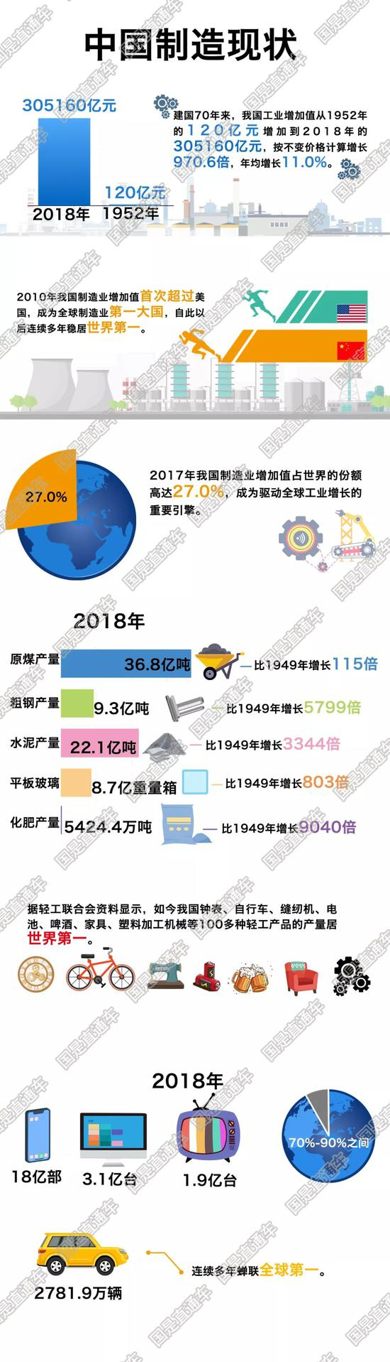 建国70年来,新中国在几乎一穷二白的基础上,建立起门类齐全的现代工业体系,实现了由一个贫穷落后的农业国成长为世界第一工业制造大国的历史性转变。