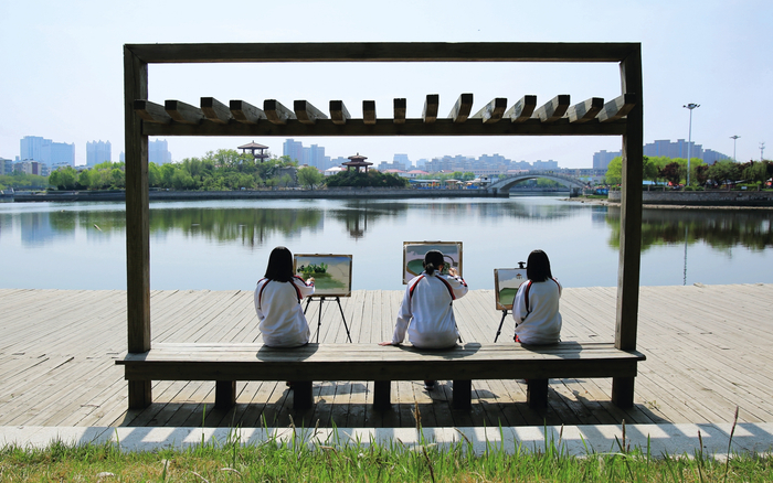 当地中学生在东营市内湿地公园写生。受访者供图