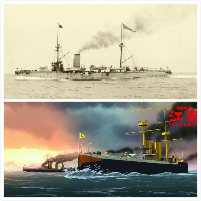 片尾,鸿远舰管带在与日军交战时,驾驶着鸿远舰冲向日舰,要与之同归于尽。这个故事的原型就是1894年的甲午海战,邓世昌率领致远舰冲向日舰。导演透露,片中的鸿远舰其实就是以致远舰1:1复原的,不过里面做了一些变动。比如,致远舰上只有一根烟囱,但是为了看上去好看一点,鸿远舰改成了两根烟囱。还有片中只出现在画像中的一个叫陈家树的角色,是一个很有名的机匠,但却在战争中牺牲了,其实历史上真有这么一个人。“我们发现一些真实的细节很打动人心,会不经意地将这些历史当中的片段放到影片中去。”
