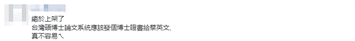 还有网友讽刺称“终于上架了,台湾硕博士论文系统应该发个博士证书给蔡英文,真不容易!”