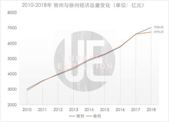 多年来,徐州与常州之间难分伯仲。2012年,徐州经济总量首次超过常州,上位第五城。到2017年,常州又以13亿的微弱优势翻转局面,至2018年,将差距扩大至近300亿。从今年的半年报来看,常州仍领先徐州超200亿。当然,这也并非一个绝对优势的距离。