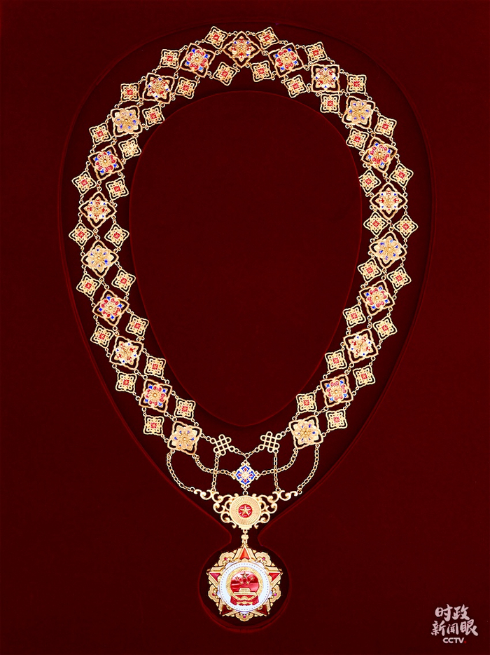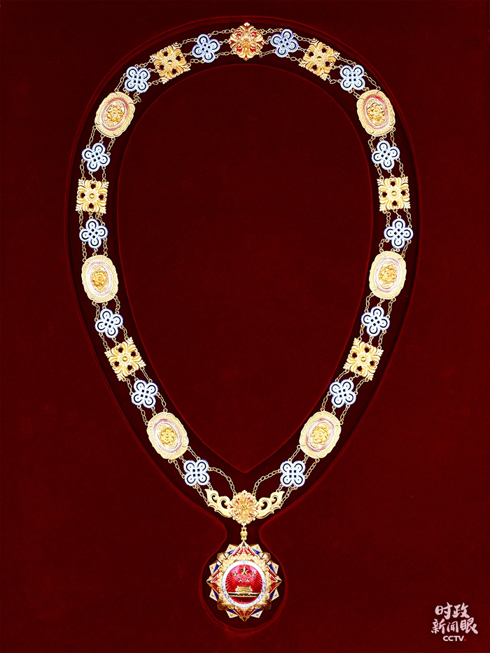 △“友谊勋章”以金色、蓝色为主色调,章体采用和平鸽、地球、握手、荷花等元素,章链采用中国结、万年青、牡丹、玉璧、兰草等元素。(央视记者魏建拍摄)