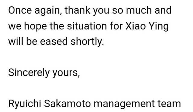 9月27日,坂本龙一管理团队也代表他本人以邮件的形式,同时回复了肖瀛和他的粉丝。