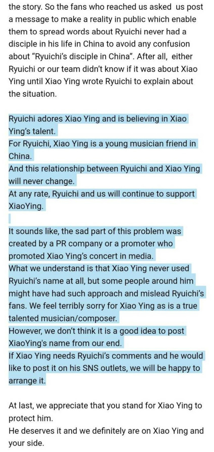 “现在听起来,这个问题里令人沮丧的部分是由公关公司或者宣传肖瀛音乐会的公司制造的。我们理解肖瀛从未打着龙一先生的名号,但是一些他身边的人有过这样的行为来误导龙一先生的粉丝。我们对肖瀛感到非常抱歉,因为他的确是一位才华横溢的音乐家/作曲家……