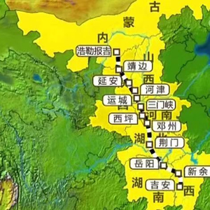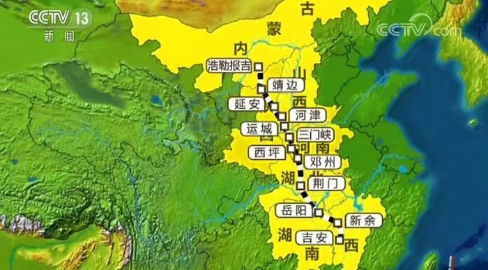 浩吉铁路全长1813.5公里,北起内蒙古鄂尔多斯市境内的浩勒报吉南站,途经内蒙古、陕西、山西、河南、湖北、湖南、江西七省份,终到京九铁路吉安站。