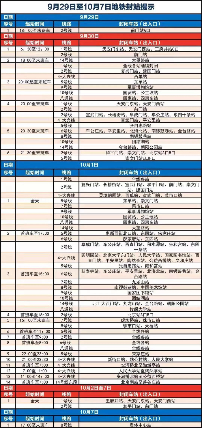7号线:10月7日延长末班车运营。其中,北京西站(开往焦化厂站方向)末班车发车时间由23:15延长至次日00:15,焦化厂站(开往北京西站方向)末班车发车时间由22:25延长至23:25。