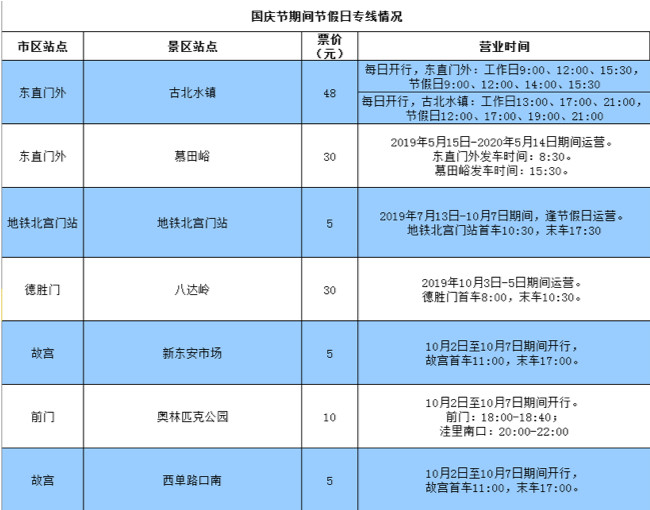 假日专线:由东直门出发,分别往返古北水镇、慕田峪长城,德胜门往返八达岭长城,前门往返奥林匹克公园,地铁北宫门至颐和园,以及故宫往返新东安市场、西单,线路一站直达,票价从10元至48元不等,持各类免票证件无效。