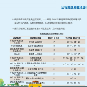 国庆期间,大广、京港澳、京藏等多条高速路段易出现拥堵缓行情况;北京部分地铁线路将进行调整;途经火车站、景点等热门地区公交车将加大运力。