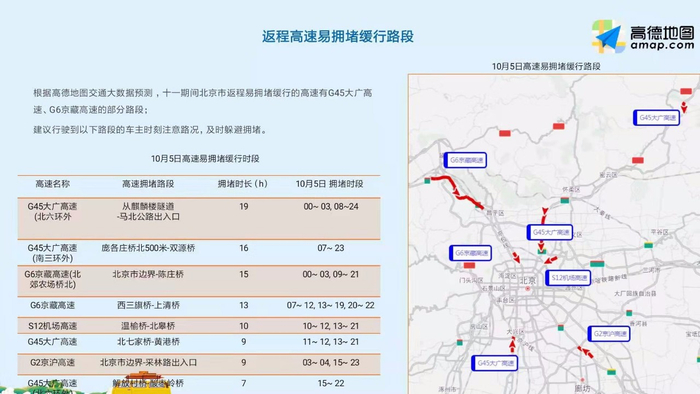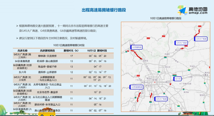 国庆期间,大广高速、京港澳高速、京藏高速、京哈高速、京沪高速等高速的部分路段易出现拥堵缓行情况。