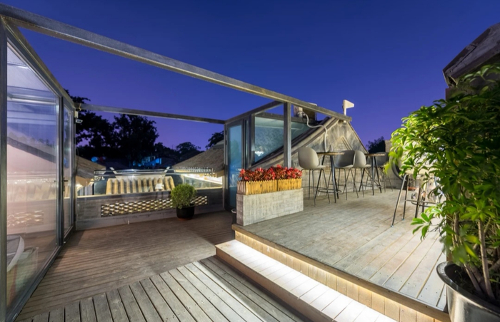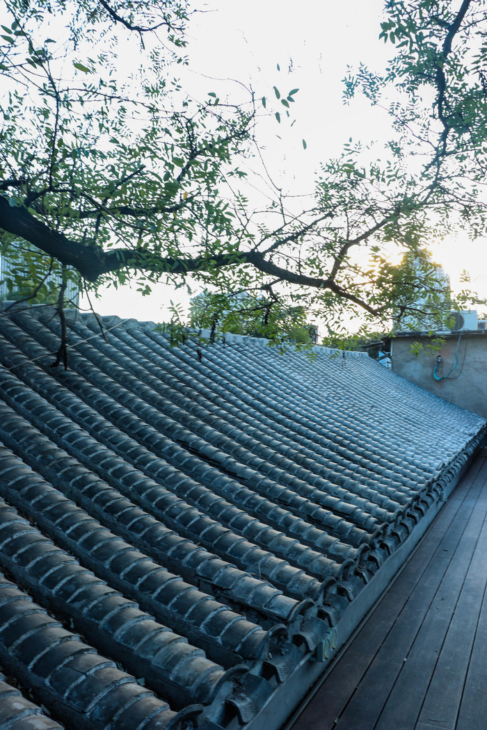 这家民宿的庭院是中式风格,比较大气简约,房顶上的露台比一般民宿要大一些,在露台上可以俯瞰极具文艺气息的“五道营胡同”,这一点非常吸引人。