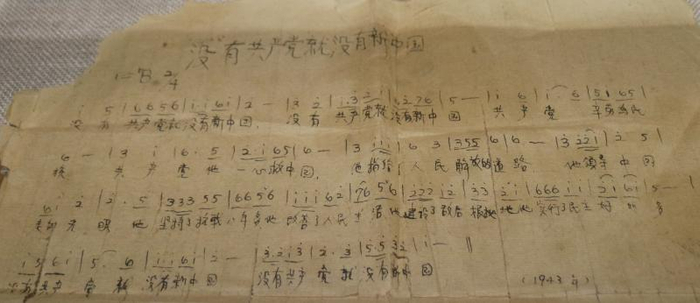 坐在东厢房的土炕上,点着小油灯,曹火星很快写就了歌词,他一遍遍地念着、改着,心中充满激情。接着,他乘热打铁开始谱曲,家乡的民间小调、戏曲曲调接连涌来,眼前浮现出孩子们打着“霸王鞭”行进演唱的景象。降b调,2/4节拍,要旋律流畅、节奏感强,还要宜于学唱,朝着这个目标,曹火星反复修改,当最后几句连续上扬的高音旋律跃出时,他酣畅的激情完全得到释放,经典名作《没有共产党就没有中国》诞生了。