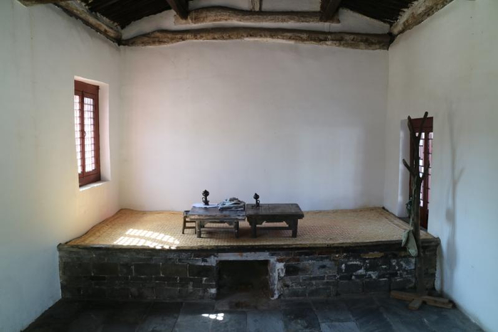 曹火星住过的中堂庙东厢房,有10多平米,还保持着当年音乐家居住创作时的模样:一扇门,两小窗,屋里横着一条土炕,炕上铺着用秸秆编成的席子,摆着两个并放一起的小方桌,桌上有盏小油灯,还有创作用的纸笔。