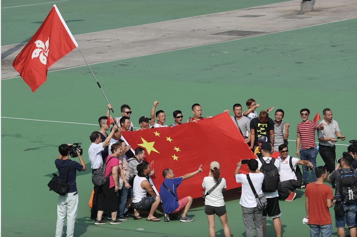 五星红旗在香港维多利亚公园高高飘扬。今天9时半,近百名香港各界市民来到维园进行“我是护旗手”欢度国庆快闪活动。在公园中央,市民们轻轻展开一面15米宽国旗高唱《五星红旗迎风飘扬》,并在国旗前合影留念。
