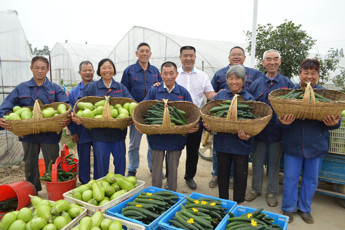 蔬菜园收获后,张新生(白衬衫者)和村民合影。受访者供图