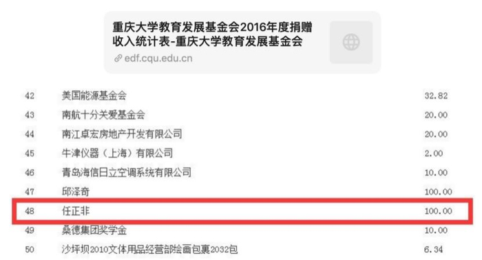 第二,任正非曾在2016年以个人名义给重庆大学捐款100万元。
