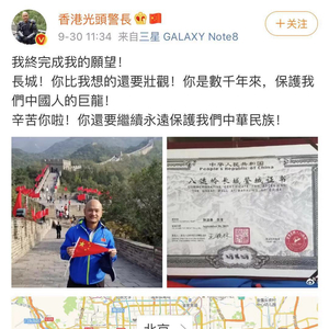 9月30日上午,受邀到北京参加国庆70周年庆祝活动的“光头警长”刘sir圆了“好汉梦”,他与香港警队的代表们登上了八达岭长城。