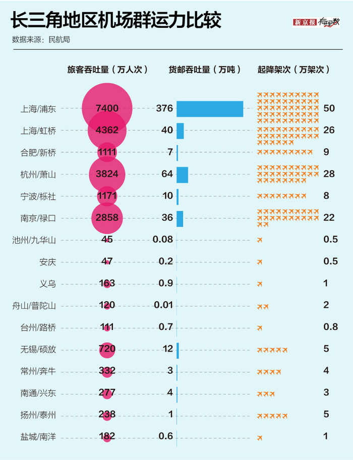 我们先来看看拥有16个民航运输机场的长三角地区,2018年长三角地区各机场旅客吞吐量总计达到2.3亿人次,远高于京津冀地区机场旅客吞吐量(1.4亿人次)。
