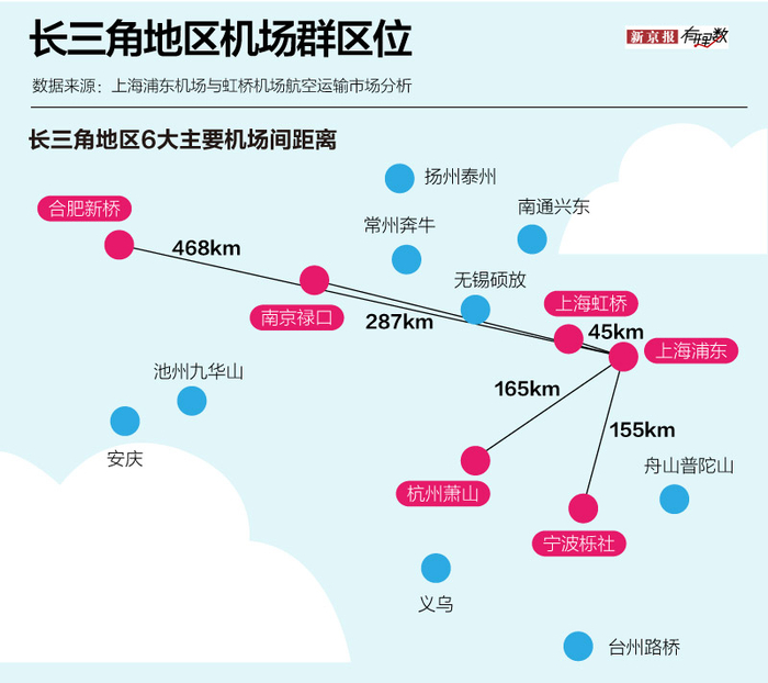 而上海浦东、上海虹桥、杭州萧山、南京禄口、宁波栎社以及合肥新桥这6个机场占了该区域90%的客运量,如何处理好他们之间的关系是实现长三角地区机场群协同发展的关键。