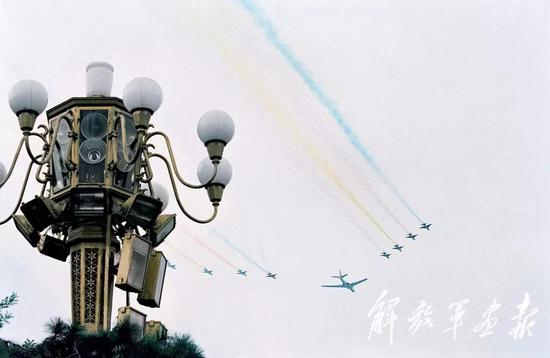 10个空中梯队、15个机型、132架作战飞机,编队总长75.637公里,10月1日上午11时05分20秒至12分19秒,依次准确无误地飞越天安门广场上空。图片来源:解放军画报
