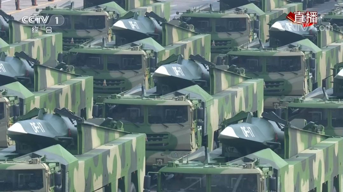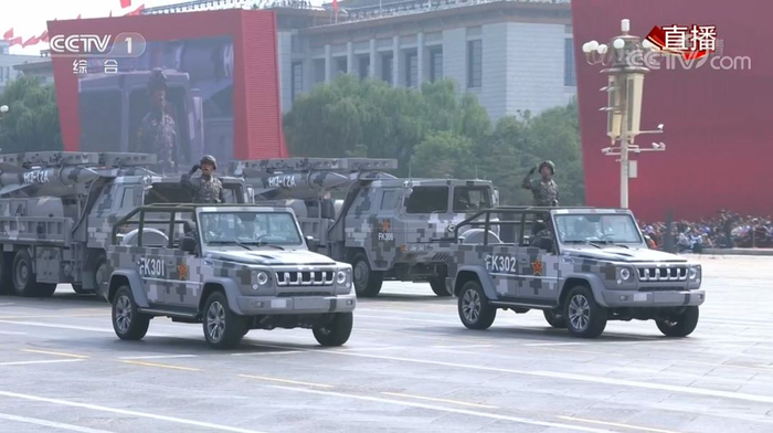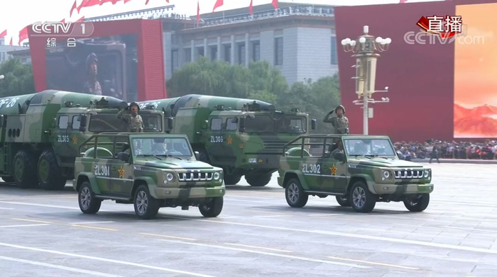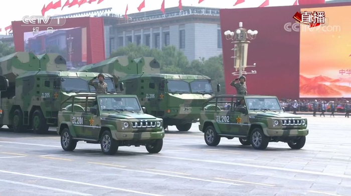 东风-17常规导弹方队,领队是张建强少将、王新国少将。“东风快递,使命必达”,东风-17常规导弹具备全天候、无依托、强突防等特点,可对中近程目标实施精确打击。