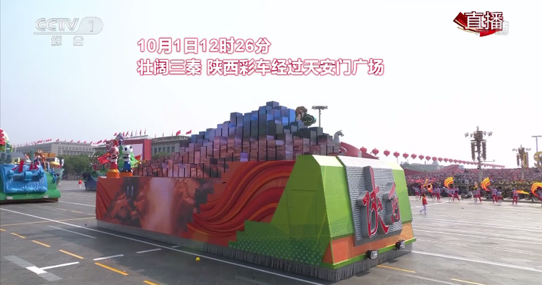 经过三次彩排,10月1日,当陕西彩车展示着巍巍宝塔山、奔驰的长安号、苍翠的大秦岭从长安街驶过时,人们看到的不仅仅是一辆彩车,更是一个充满朝气、开放创新、张开怀抱在追赶超越中奋进的陕西。