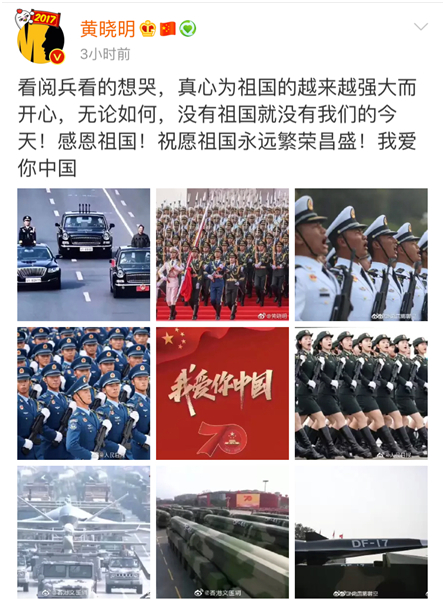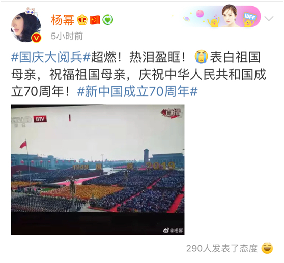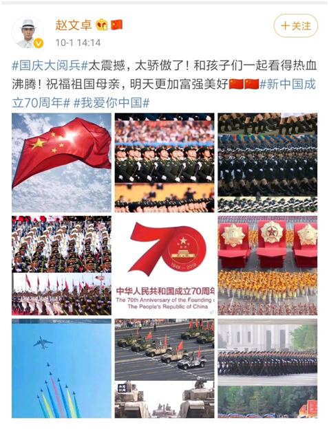 [环球网报道 记者 朱梦颖]今天上午,庆祝中华人民共和国成立70周年大会、阅兵式和群众游行在北京天安门广场隆重举行,世界瞩目,国人骄傲。众明星艺人也在微博发文,“祝福祖国母亲”、“祝福人民”。