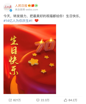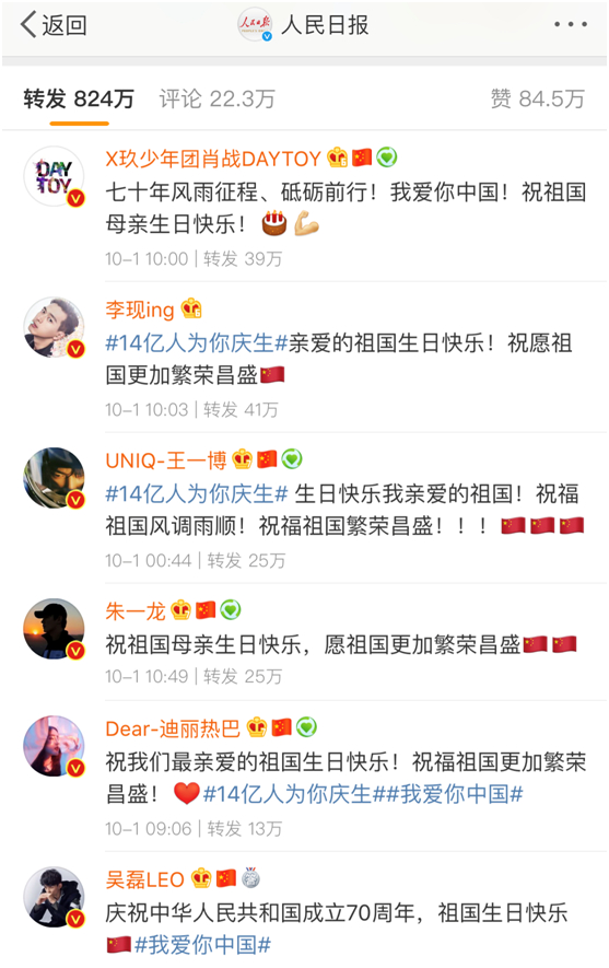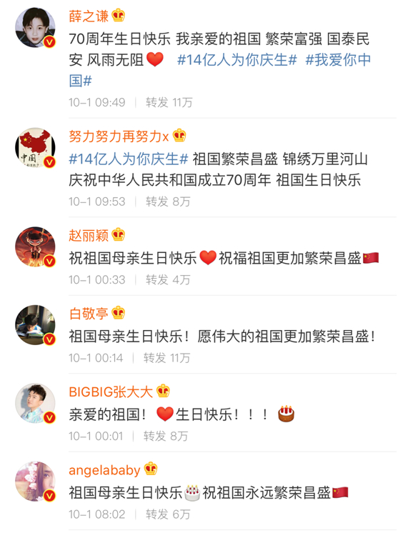 原标题:庆祝新中国成立七十周年 众明星艺人发微博“祝福祖国母亲”