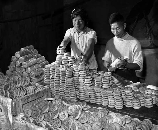 1961年9月21日,山西省闻喜县东镇供销合作社的工作人员在包装月饼,准备供应中秋节市场。那时候的月饼做工都非常简单,大多为果仁馅,是当时中秋节非常珍贵的节日食物。