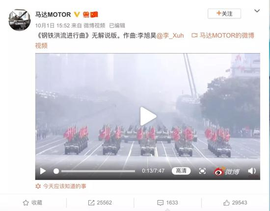 网友们“顺藤摸瓜”找到了年轻作曲家李旭昊的个人微博,并纷纷在线求歌,希望中国人民解放军联合军乐团能够出一版庆祝中华人民共和国成立70周年大阅兵原声大碟。毕竟整场阅兵不仅仅是开头引爆全场的《钢铁洪流进行曲》十分好听,随后人民解放军联合军乐团为不同装备方队量身定制的多首首军乐交响作品也十分好听,其中包括东风系列战略导弹出场时的《东风浩荡进行曲》和空军战机出场时的《雄鹰出击进行曲》等等。