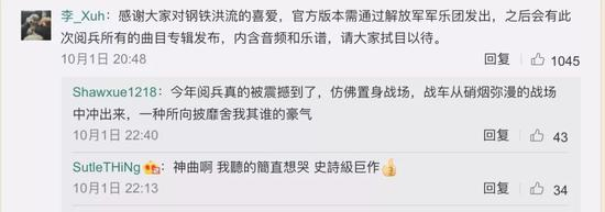 面对被这首“阅兵原声”“洗脑”的广大网友在线求歌,歌曲创作者李旭昊也表示,“感谢大家对钢铁洪流的喜爱,官方版本需通过解放军军乐团发出,之后会有此次阅兵所有的曲目专辑发布,内含音频和乐谱,请大家拭目以待。”