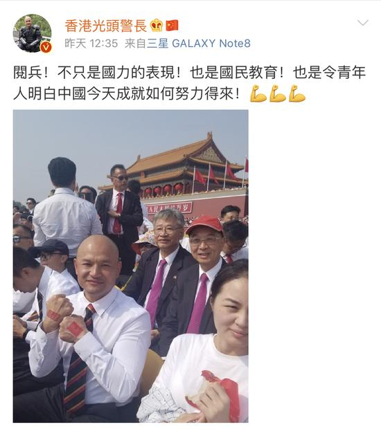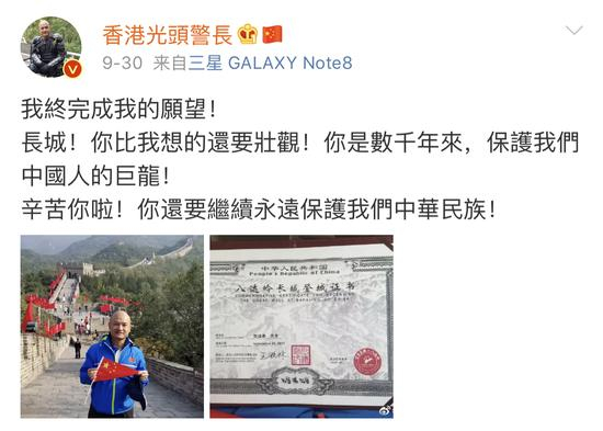 [环球网报道 记者 朱梦颖]来京参加国庆观礼的香港警务处机动部队警署警长刘泽基——光头警长刘Sir在实现爬长城、看大阅兵的心愿后,今日启程返回香港。10月2日下午16时43分,刘Sir在微博发文告别,“北京同胞们!我要回香港了!但你们永远在我心中!”