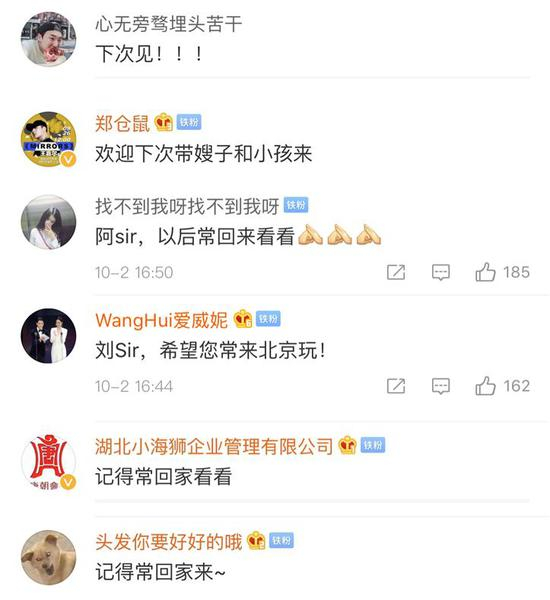 在这条微博下,网友热烈欢迎刘Sir“下次再来”,“常回家看看”。↓