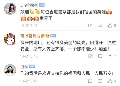 而更多的,则是提醒刘Sir及其他香港警察“注意安全”,并加油打气说:“祖国是你最坚强的后盾”。↓