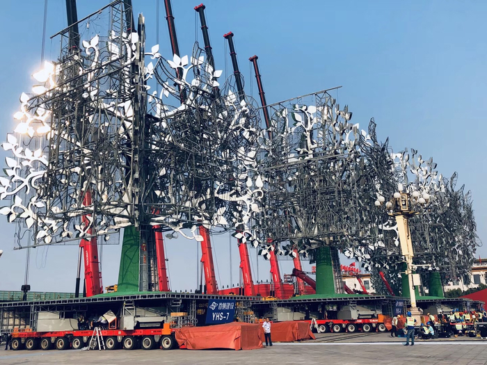 一棵烟花树高25米,重达300吨,而这样7个庞然大物,是在联欢活动的前三小时内现场完成搭建、调试的。