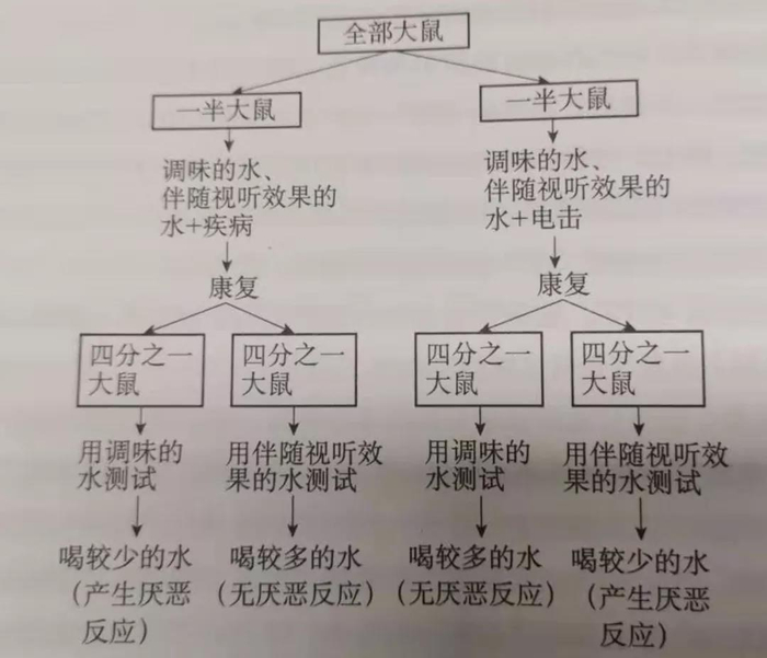 几天之后,在实验的第二阶段,当所有大鼠都康复之后,再一次让大鼠从喷水口喝水。但这一次,给一半大鼠喝的是调味的水,但没有闪光灯或电击。另外一半的大鼠,在每次舔之后都会伴随闪光灯和电击,但是给的水并没有调味。