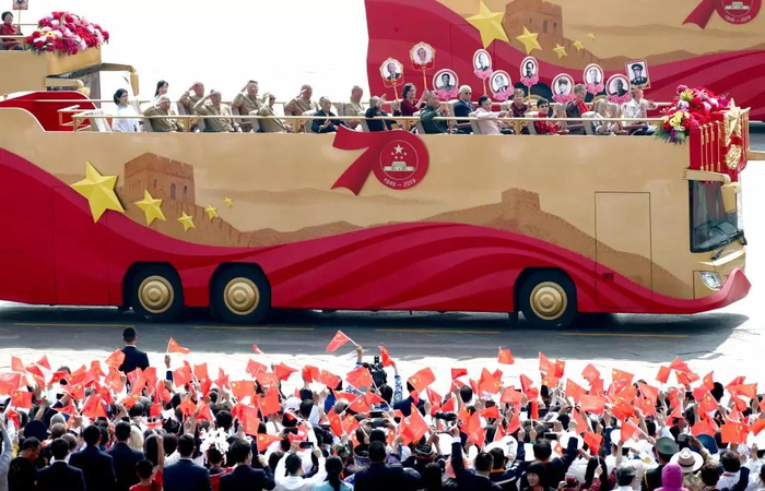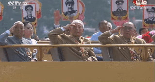 一曲《红旗颂》奏响,当“致敬方阵”的礼宾车上,老一辈党和国家、军队领导人亲属代表,老一辈建设者和亲属代表,新中国成立前参加革命工作的老战士,老一辈军队退役英模、民兵英模和支前模范代表等从天安门前经过时,全场所有人自发起立,向英雄们致以崇高的敬意。