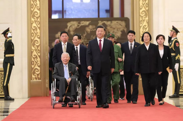 万众瞩目之下,习近平总书记同他们一同步入会场。在雄壮激昂的《向祖国致敬》乐曲声中,总书记为他们一一颁授勋章奖章,亲切握手、表示祝贺。