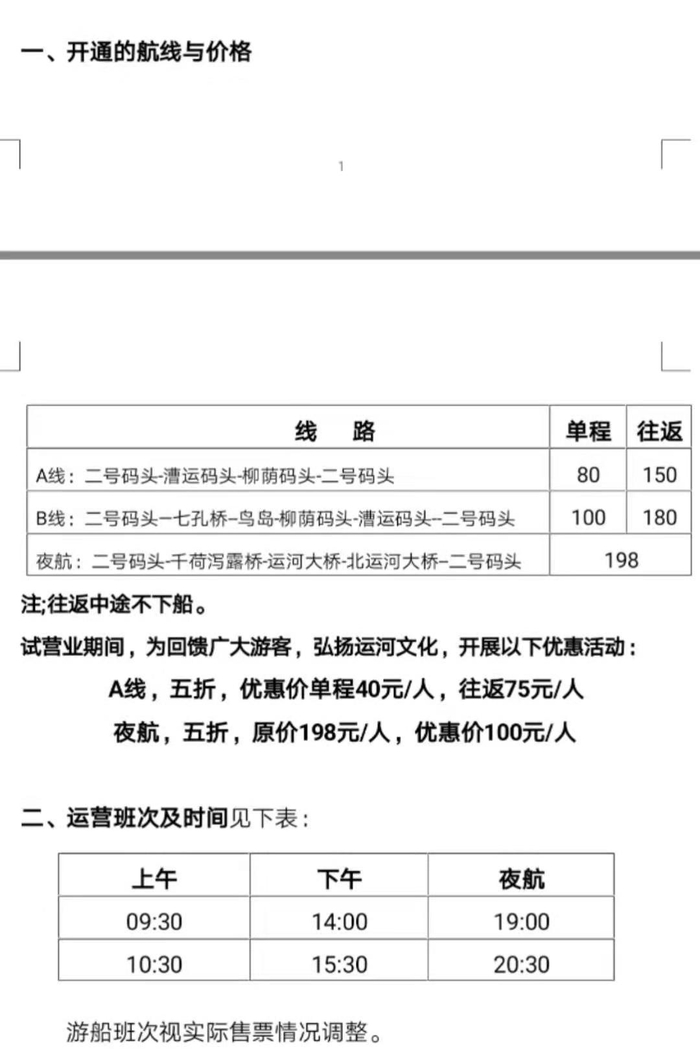 A线:二号码头-漕运码头-柳荫码头-二号码头 80 150