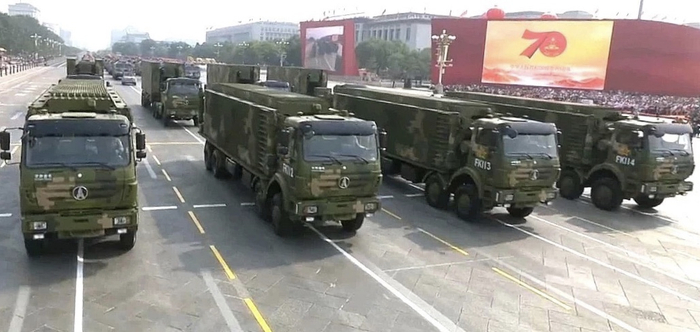 在战略导弹方队中,东风5B战略常规导弹是由陕汽牵引车运输而来,牵引车采用6x6驱动形式,上装导弹发射指挥系统,后部牵引作战导弹装备。