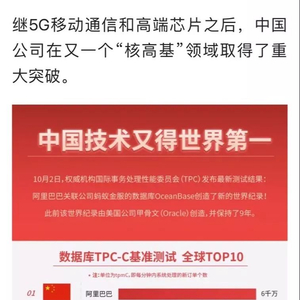 TPC-C基准测试被誉为“数据库领域世界杯”,是全球公认的数据库性能评价金指标,美国公司Oracle(甲骨文)已经垄断了9年冠军。