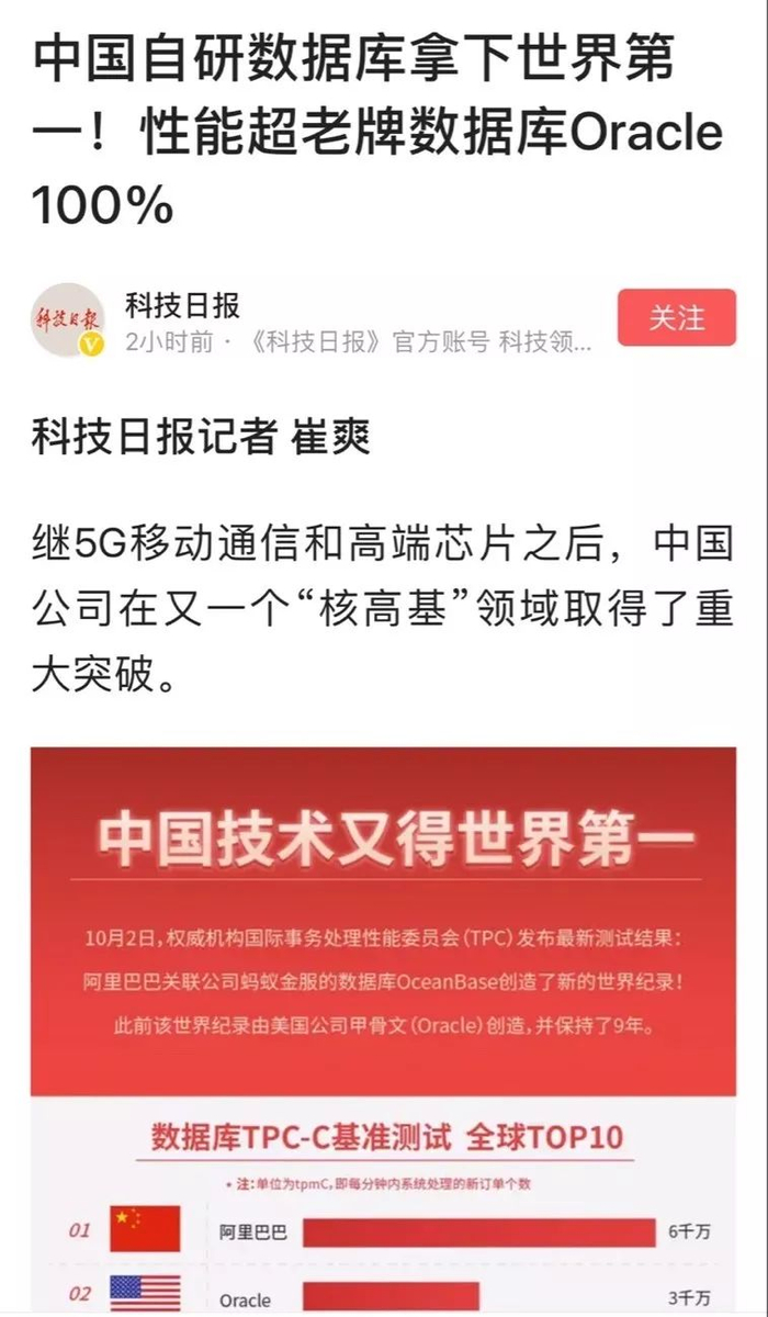 科技日报报道,10月2日,业内权威机构国际事务处理性能委员会(TPC)在官网披露了最新的TPC-C 数据库基准性能测试结果,蚂蚁金服自主研发的分布式关系数据库OceanBase,打破美国公司甲骨文(Oracle)保持了9年的世界纪录,成为首个登顶该榜单的中国公司。
