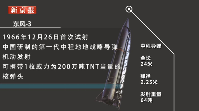 1966年12月26日首次试射,中国研制的第一代中程地地战略导弹,机动发射,可携带1枚威力为200万吨TNT当量的核弹头。