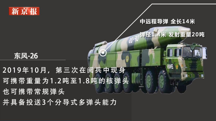 2019年10月,第三次在阅兵中现身,可携带重量为1.2吨至1.8吨的核弹头,也可携带常规弹头,并具备投送3个分导式多弹头能力。