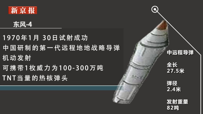 1970年1月 30日试射成功,中国研制的第一代远程地地战略导弹,机动发射,可携带1枚威力为100-300万吨TNT当量的热核弹头。