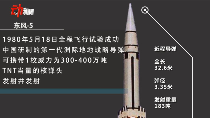 1980年5月18日全程飞行试验成功,中国研制的第一代洲际地地战略导弹,可携带1枚威力为300-400万吨TNT当量的核弹头,发射井发射。