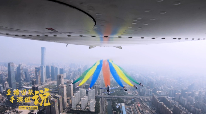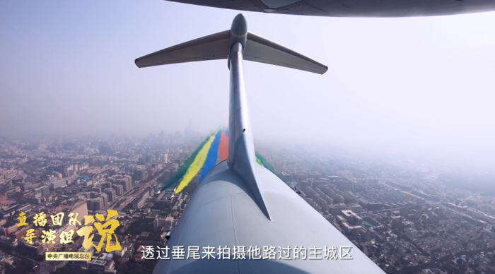 这是给新媒体特供的镜头,是十一当天,我们的运-20飞机飞过广场上空的时候,你看我们的镜头放在哪儿,放在它的垂尾上面来拍摄大大的翅膀飞过去。像这样的镜头好多。