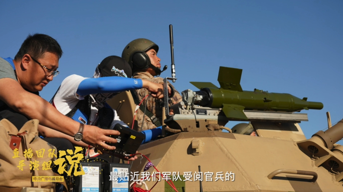 比如,你看我们坦克的画面,炮筒上面拍摄到我们的驾驶员丁辉班长。这样一个画面,就是我们“舞枪弄棒”的第一个。